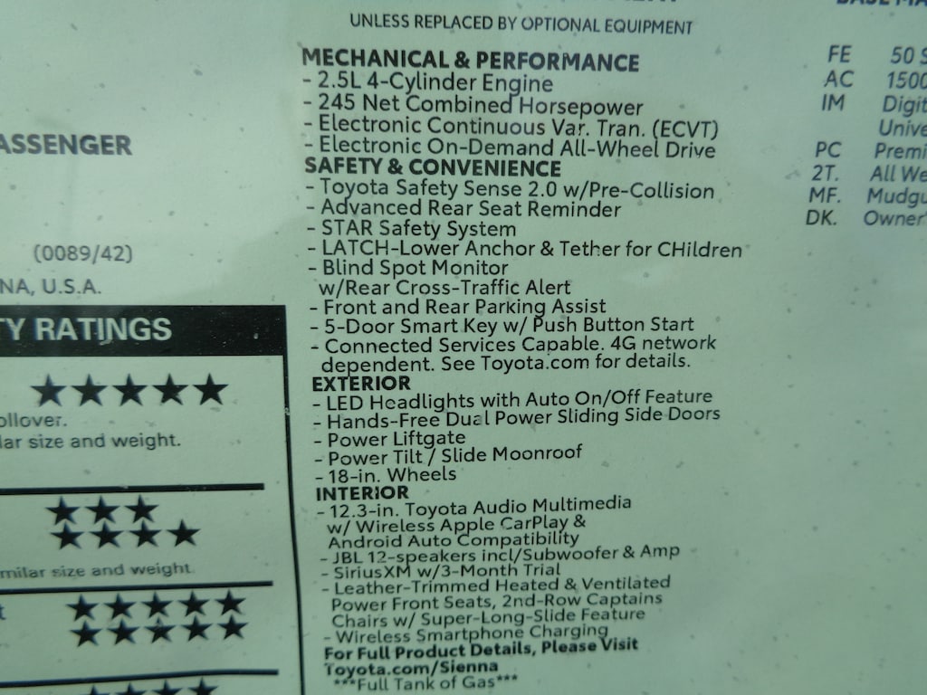 - Toyota Safety Sense 2.0 (TSS 2.0) Pre-Collision System with Pedestrian Detection (PCS w/PD), Lane Departure Alert with Steering Assist (LDA w/SA), Lane Tracing Assist (LTA), Automatic High Beams (AHB), Full-Speed Range Dynamic Radar Cruise Control (DRCC), and Road Sign Assist (RSA)